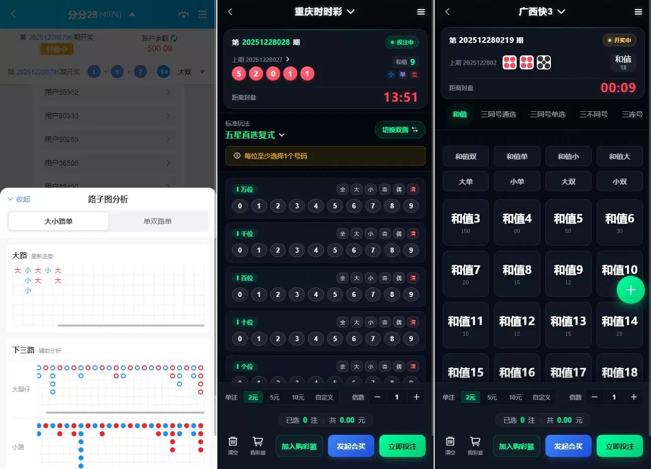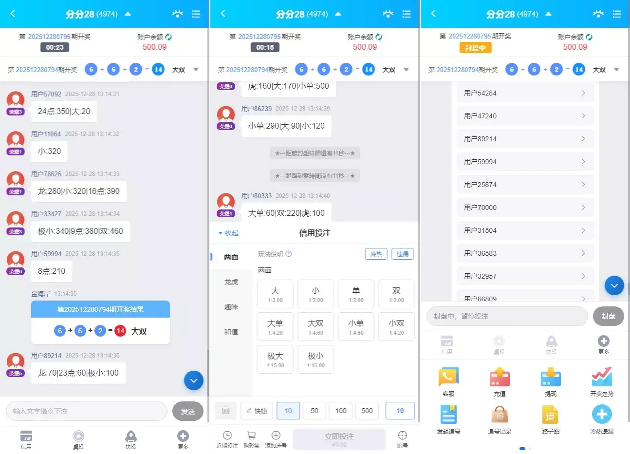 有完整的im即时通讯功能,PC28也是可以聊天下注的,还有桌投、快投、信用投注这三种方式,充值提现都是多渠道,系统彩有预算开奖功能,还是自开奖的不需要添加计划任务