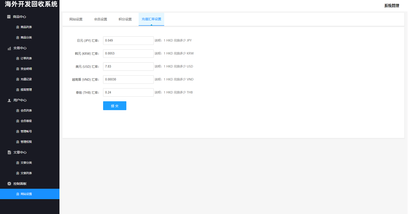 系统支持:访问邀请码,自定义回收价格,信用分,充值汇率,默认货币,权限代理等功能