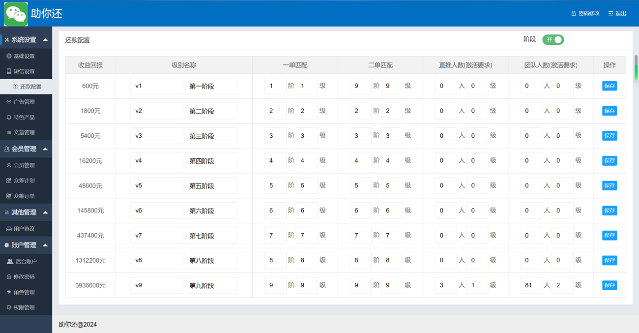 有钱还平台新注册会员,即新入的负债者要分9次分别资助先来的11名负债者每人200元,这笔资助不是一次性给到对方,而是分九个梯队执行,梯队次数和资助次数一样,计划几个梯队就帮助别的负债者几次